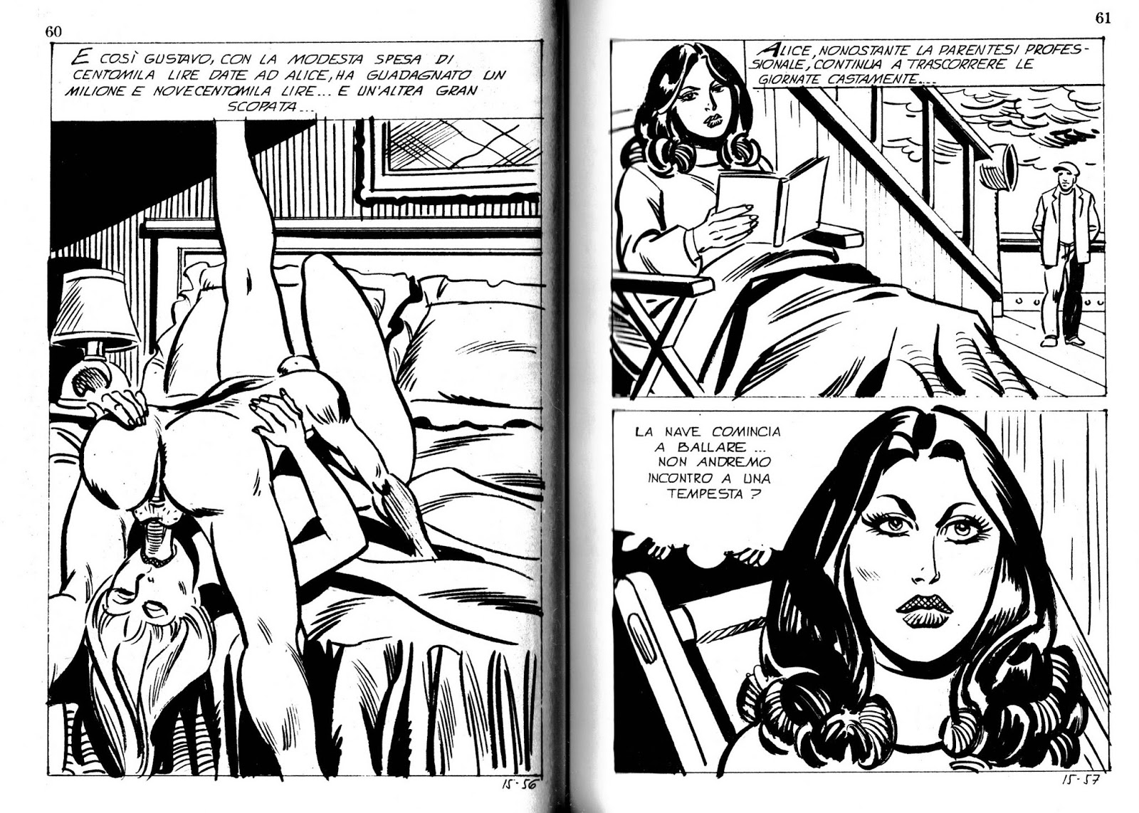 PS: Ringrazio l'accoppiata CHARLES&DIABOLIK per questa scansione che ci riporta sul blog dopo un po' di tempo un episodio de LA PROFESSIONISTA. Puntata leggera, più virata sulla commedia sexy, dove Alice è coinvolta prima in una scommessa erotica e poi si trastulla con un marinaio nero e infine col capitano delle nave da crociera...peccato solo per il momento veramente trash con lo sfigatello (che purtroppo ha il "grosso" delle scene erotiche dell'episodio) che vomita sulla principale fonte di guadagno della protagonista...momento disgustoso, ma che ogni tanto gli autori di questa (e di altre serie) si "divertivano" (!!) a inserire nei loro fumetti...mah (?!)....L'episodio è una ristampa del numero 15 della serie originale anni '80, riproposto poi nel 1993 per la collana SERIE ROSSA con un nuovo titolo ANGELO DEL SESSO. Nell'albo come vedrete, al termine del fumetto vengono proposte delle barzellettacce sporcaccione, vignette umoristiche e pubblicità di altre ristampe EDIFUMETTO tra le quali una sempre di questa serie intitolata LA POMATA DELLA VERGINITA' , titolo identico all'episodio di DE SADE pubblicato recentemente qua sul blog...fantasia a go go insomma....