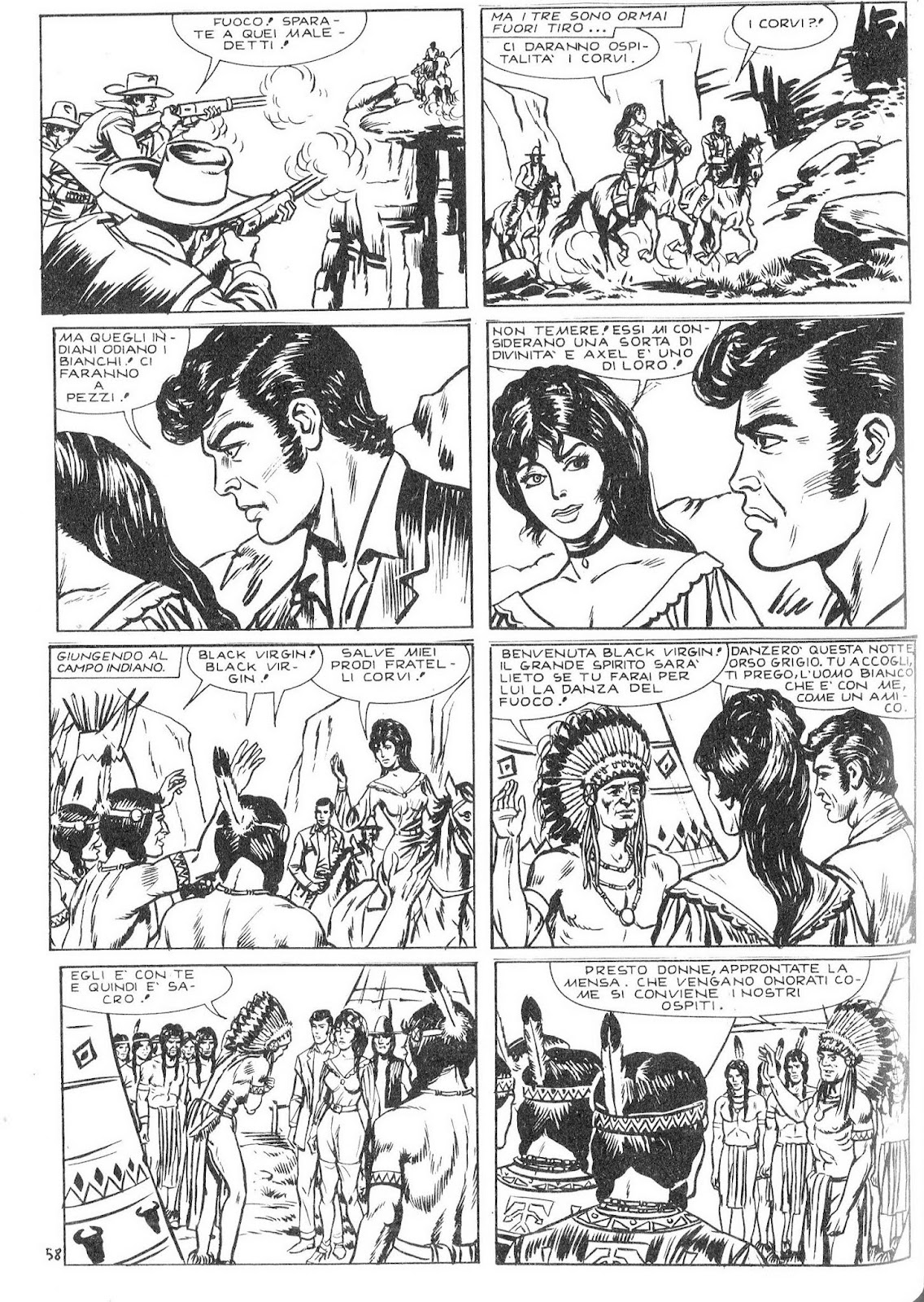 La trama originale della serie verteva sulle avventure della bella Helena Tucker, una sorta di mezzo-sangue (nativo americana e inglese) che dopo essere stata violentata dal prepotente signorotto Henry Plummer, decide di vendicarsi di lui alleandosi con la tribù di pellerossa nella quale è cresciuta, assumendo il nome dell'eroina Vergine Nera. In questa sua opera di vendetta incontra poi il giovane e bel cowboy Marcus Collins del quale si innamora. La sorella di quest'ultimo, Rosy, però è l'amante proprio del nemico numero uno della Vergine Nera e quindi la faccenda diviene sempre più morbosa, pericolosa e intricata... Come dicevo la serie è curiosa, ma ha molti difetti, non poteva però mancare almeno un suo episodio come cronaca e testimonianza del nostro blog . ZERO IN CONDOTTA infatti oltre a intrattenere con i fumettacci si propone comunque di fare anche da archivio storico e informativo delle varie pubblicazioni erotiche dell'epopea dei sexy-pocket. Attendiamo quindi nei commenti i vostri pareri in proposito, fateci sapere se vi ricordavate di questa serie oppure se, come alla sottoscritta, giunge del tutto nuova. Ringraziamo poi il buon AKUJO per lo scan di questa rara ristampa hard...